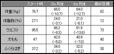 ■35歳、男性、外資系企業勤務 ※年齢はスタート時(2007年) ■国内・外の出張が多く深夜までの仕事が多い。 ■ダイエットは今まで数回繰り返して、リバウンドが多い。 ![]() ※実際はもっと細かいところまで全身採寸します。上記一部記載。 |