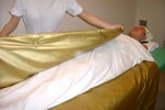 もみほぐした後バンテージで引き締め、アロマエッセンスを含んだ蒸しタオルで温めます。カラダの中の老廃物・ストレスが"フッ"と抜ける気持ち良さです。